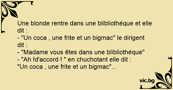 C’est une blonde qui rentre dans une bibliothèque et qui demande à l’accueil : - Bonjour, je voudrais un hamburger ? un grand coca et une grande frite ! Le bibliothécaire : - Madame, vous êtes dans...