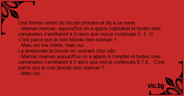 - Maman maman, aujourd'hui on a appris l'alphabet et toutes mes camarades s'arrêtaient à D alors que moi je continuais E, F, G... C'est parce que je suis blonde hein maman ?