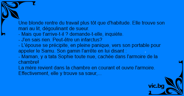 - Mais... qu'est-ce-que tu branles là-dedans, hurle-t-elle? Mon mari est en train de faire une crise cardiaque, et toi tu joues à cache-cache avec le petit!