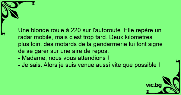 Une blonde roule à 220 sur l'autoroute. Elle repère un radar mobile, mais c'est trop таrd. Deux kilomètres plus lоin, des motards de la gendarmerie lui font signe de se garer sur une aire de repos.