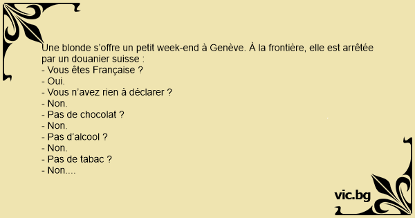 Une blonde s’offre un petit week-end à Genève. À la frontière, elle est arrêtée par un douanier suisse :