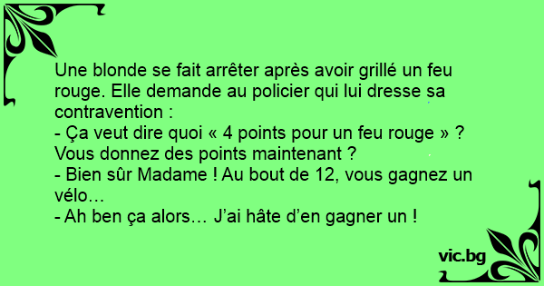 Une blonde se fait arrêter après avoir grillé un feu rouge. Elle demande au policier qui lui dresse sa contravention :
