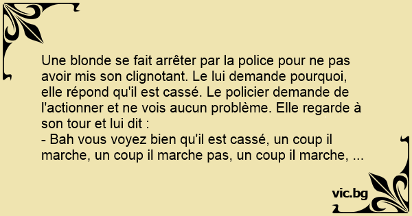 Une blonde se fait arrêter par la police pour ne pas avoir mis son clignotant. Le lui demande pourquoi, elle répond qu'il est cassé. Le policier demande de l'actionner et ne vois aucun problème. Elle regarde à son tour et lui dit :