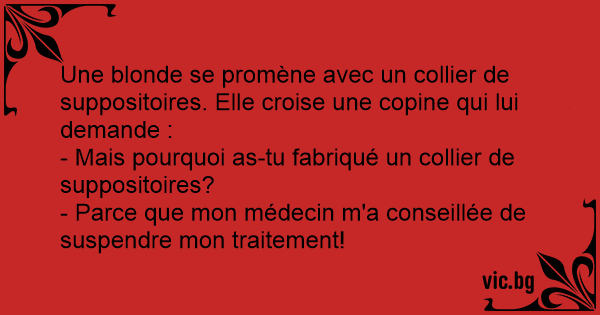 Une blonde se promène avec un collier de suppositoires. Elle croise une copine qui lui demande :