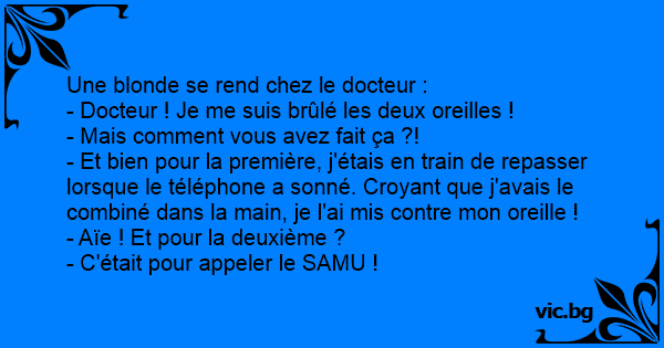 Un Belge va voir son médecin et lui dit : - Je suis très embêté docteur, je me suis brûlé les oreilles. Le médecin étonné lui demande : - Mais comment cela vous est arrivé ? - Ben j'étais en train...