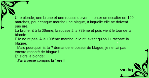 Une blonde, une brune et une rousse doivent monter un escalier de 100 marches, pour chaque marche une blague, à laquelle elle ne doivent pas rire.