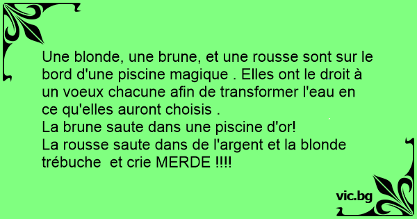 Une blonde, une brune, et une rousse sont sur le bord d'une piscine magique . Elles ont le droit à un voeux chacune afin de transformer l'eau en ce qu'elles auront choisis .