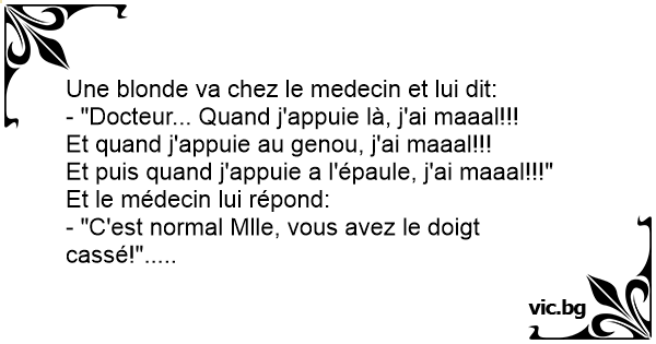 Une jeune femme blonde va voir son docteur. - "Ou avez-vous mal ?" Demande le docteur. - "Vous devez m'aider, j'ai mal partout." Répond la jeune femme. - "Que voulez-vous dire , partout?"......