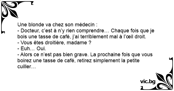 - Docteur, c’est à n’y rien comprendre… Chaque fois que je bois une tasse de café, j’ai terriblement mal à l’œil droit.