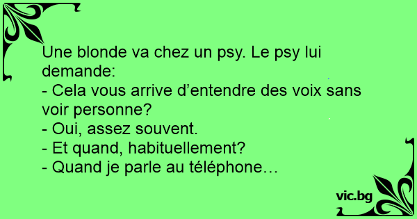 Une blonde va chez un psy. Le psy lui demande:<br />- Cela vous arrive d’entendre des voix sans voir personne?<br />- Oui, assez souvent.<br />- Et quand, habituellement?<br />- Quand je parle au téléphone…