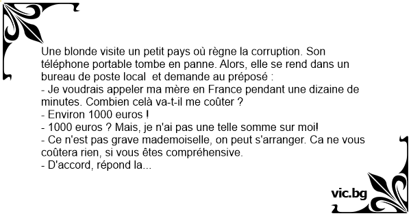 Une blonde visite un petit pays où règne la corruption. Son téléphone portable tombe en panne. Alors, elle se rend dans un bureau de poste local et demande au préposé :