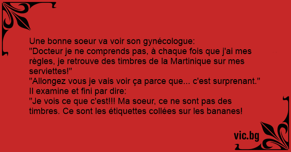 "Docteur je ne comprends pas, à chaque fois que j'ai mes règles, je retrouve des timbres de la Martinique sur mes serviettes!"