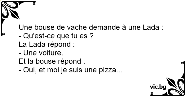 Une bouse de vache demande à une Lada :<br />- Qu'est-ce que tu es ?<br />La Lada répond :<br />- Une voiture.<br />Et la bouse répond :<br />- Oui, et moi je suis une pizza...