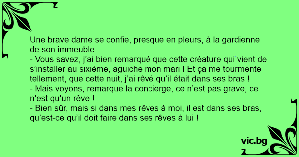 - Vous savez, j’ai bien remarqué que cette créature qui vient de s’installer au sixième, aguiche mon mari ! Et ça me tourmente tellement, que cette nuit, j’ai rêvé qu’il était dans ses bras !
