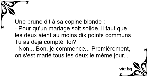 - Pour qu'un mariage soit solide, il faut que les deux aient au moins dix points communs. Tu as déjà compté, toi?