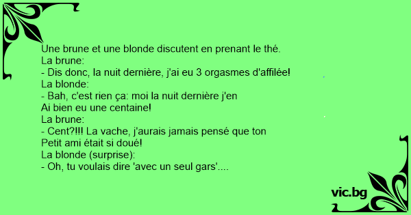 - Dis donc, la nuit dernière, j'ai eu 3 orgasmes d'affilée!