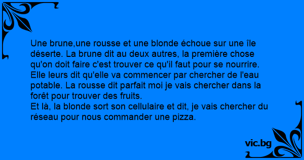 Une brune,une rousse et une blonde échoue sur une île déserte. La brune dit au deux autres, la première chose qu'on doit faire c'est trouver ce qu'il faut pour se nourrire.