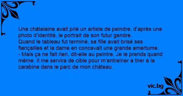 - Mais ça ne fait rien, dit-elle au peintre. Je le prends quand même. Il me servira de cible pour m’entraîner à tirer à la carabine dans le parc de mon château.