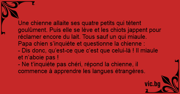 - Ne t’inquiète pas chéri, répond la chienne, il commence à apprendre les langues étrangères.