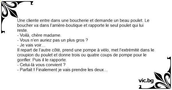 Une cliente entre dans une boucherie et demande un beau poulet. Le boucher va dans l’arrière-boutique et rapporte le seul poulet qui lui reste. - Voilà, chère madame. - Vous n’en auriez pas un plus gros ? - Je vais voir… Il repart de l’autre côté, prend une pompe à vélo, met l’extrémité dans le croupion du poulet et donne trois ou quatre coups de pompe pour le gonfler. Puis il le rapporte. - Celui-là vous convient ? - Parfait ! Finalement je vais prendre les deux…