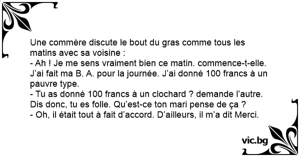 - Tu as donné 100 francs à un clochard ? demande l’autre. Dis donc, tu es folle. Qu’est-ce ton mari pense de ça ?