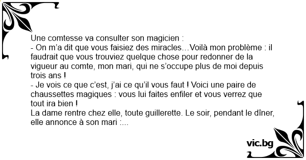 - On m’a dit que vous faisiez des miracles…Voilà mon problème : il faudrait que vous trouviez quelque chose pour redonner de la vigueur au comte, mon mari, qui ne s’occupe plus de moi depuis trois ans !