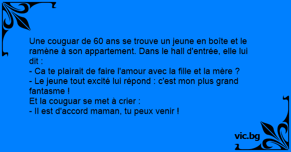 Une couguar de 60 ans se trouve un jeune en boîte et le ramène à son appartement. Dans le hall d'entrée, elle lui dit :