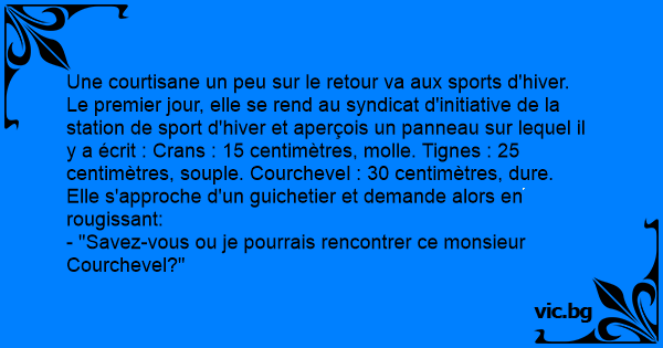 Une courtisane un peu sur le retour va aux sports d'hiver. Le premier jour, elle se rend au syndicat d'initiative de la station de sport d'hiver et aperçois un panneau sur lequel il y a écrit : Crans : 15 centimètres, molle. Tignes : 25 centimètres, souple. Courchevel : 30 centimètres, dure.
