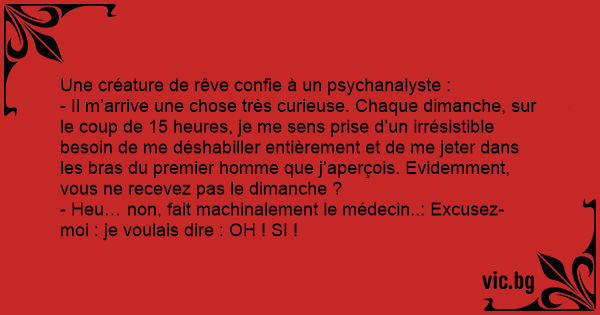 - Il m’arrive une chose très curieuse. Chaque dimanche, sur le coup de 15 heures, je me sens prise d’un irrésistible besoin de me déshabiller entièrement et de me jeter dans les bras du premier homme que j’aperçois. Evidemment, vous ne recevez pas le dimanche ?