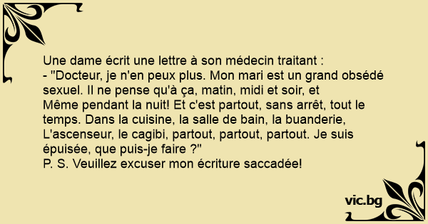 - "Docteur, je n'en peux plus. Mon mari est un grand obsédé sexuel. Il ne pense qu'à ça, matin, midi et soir, et