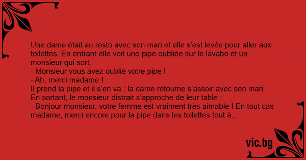 Une dame était au resto avec son mari et elle s’est levée pour aller aux toilettes. En entrant elle voit une pipe oubliée sur le lavabo et un monsieur qui sort.