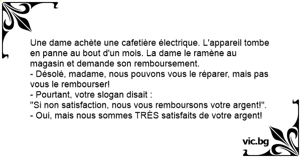 Une dame achète une cafetière électrique. L'appareil tombe en panne au bout d'un mois. La dame le ramène au magasin et demande son remboursement.
