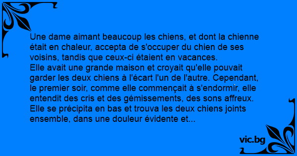 Une dame aimant beaucoup les chiens, et dont la chienne était en chaleur, accepta de s'occuper du chien de ses voisins, tandis que ceux-ci étaient en vacances.