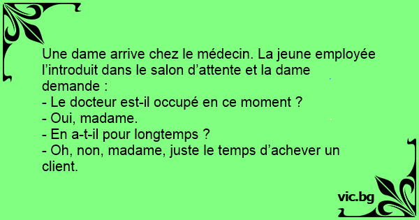 Une dame arrive chez le médecin. La jeune employée l’introduit dans le salon d’attente et la dame demande :