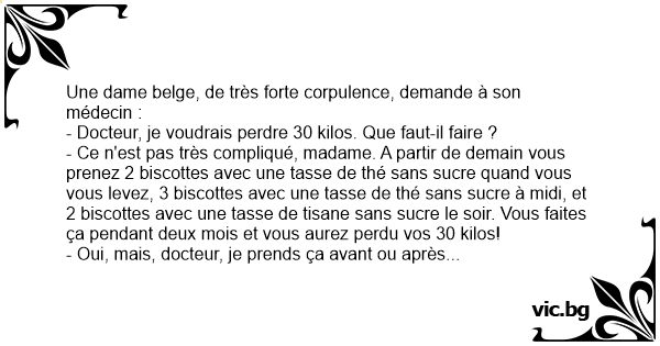- Ce n'est pas très compliqué, madame. A partir de demain vous prenez 2 biscottes avec une tasse de thé sans sucre quand vous vous levez, 3 biscottes avec une tasse de thé sans sucre à midi, et 2 biscottes avec une tasse de tisane sans sucre le soir. Vous faites ça pendant deux mois et vous aurez perdu vos 30 kilos!