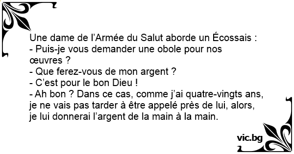 - Ah bon ? Dans ce cas, comme j’ai quatre-vingts ans, je ne vais pas tarder à être appelé près de lui, alors, je lui donnerai l’argent de la main à la main.
