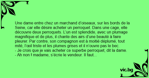 Une dame entre chez un marchand d’oiseaux, sur les bords de la Seine, car elle désire acheter un perroquet. Dans une cage, elle découvre deux perroquets. L’un est splendide, avec un plumage magnifique et de plus, il chante des airs d’une beauté à faire pleurer. Par contre, son compagnon est à moitié déplumé, tout mité, l’œil triste et les plumes grises et il n’ouvre pas le bec.