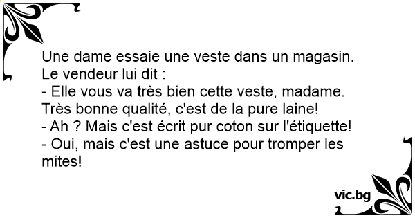 - Elle vous va très bien cette veste, madame. Très воnnе qualité, c'est de la pure laine!