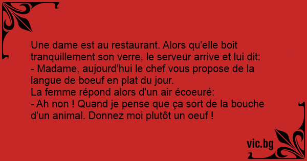 Une femme au serveur : - Quel est le plat du jour ? - Langue de bœuf Madame - Ah beurk manger quelque chose qui sort de la bouche d'un animal ! Faites moi plutôt un œuf...