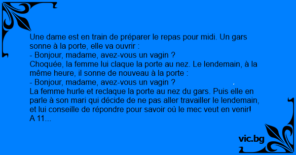 En kvinne er hjemme når hun hører noen banke på døra hennes. Hun går til døra, åpner den, og ser en mann som står der. Han spør damen: «Har du en vagina?» Hun smeller døra igjen i avsky. Neste...