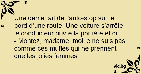 Une dame fait de l’auto-stop sur le bord d’une route. Une voiture s’arrête, le conducteur ouvre la portière et dit :