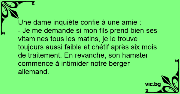 - Je me demande si mon fils prend bien ses vitamines tous les matins, je le trouve toujours aussi faible et chétif après six mois de traitement. En revanche, son hamster commence à intimider notre berger allemand.