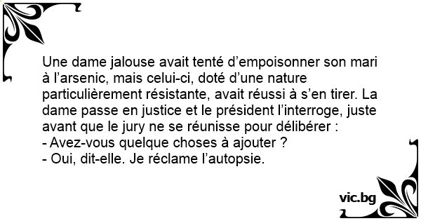 Une dame jalouse avait tenté d’empoisonner son mari à l’arsenic, mais celui-ci, doté d’une nature particulièrement résistante, avait réussi à s’en tirer. La dame passe en justice et le président l’interroge, juste avant que le jury ne se réunisse pour délibérer :