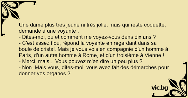 Une dame plus très jeune ni très jolie, mais qui reste coquette, demande à une voyante :