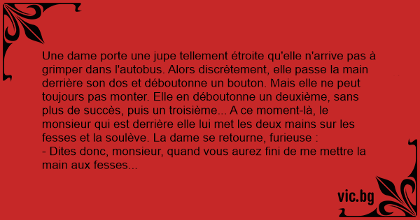 Une dame porte une jupe tellement étroite qu'elle n'arrive pas à grimper dans l'autobus. Alors discrètement, elle passe la main derrière son dos et déboutonne un bouton. Mais elle ne peut toujours pas monter. Elle en déboutonne un deuxième, sans plus de succès, puis un troisième... A ce moment-là, le monsieur qui est derrière elle lui met les deux mains sur les fesses et la soulève. La dame se retourne, furieuse :