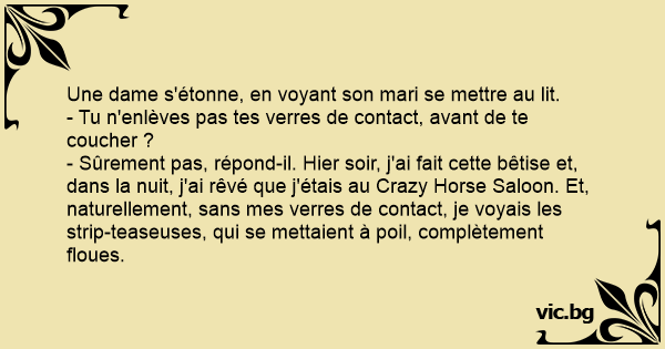 - Sûrement pas, répond-il. Hier soir, j'ai fait cette bêtise et, dans la nuit, j'ai rêvé que j'étais au Crazy Horse Saloon. Et, naturellement, sans mes verres de contact, je voyais les sтriр-teaseuses, qui se mettaient à poil, complètement floues.