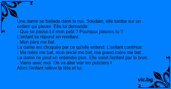 Une dame se ballade dans la rue. Soudain, elle tombe sur un enfant qui pleure. Elle lui demande: