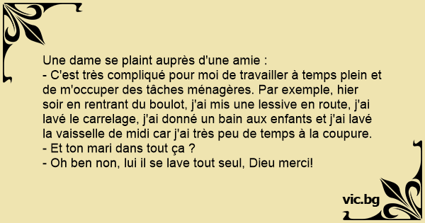 - C'est très compliqué pour moi de travailler à temps plein et de m'occuper des tâches ménagères. Par exemple, hier soir en rentrant du boulot, j'ai mis une lessive en route, j'ai lavé le carrelage, j'ai donné un bain aux enfants et j'ai lavé la vaisselle de midi car j'ai très peu de temps à la coupure.