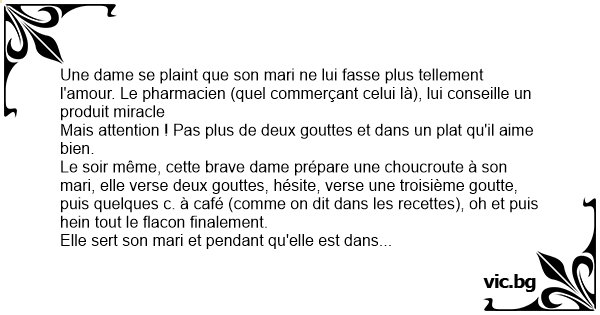 Une dame se plaint que son mari ne lui fasse plus tellement l'amour. Le pharmacien (quel commerçant celui là), lui conseille un produit miracle