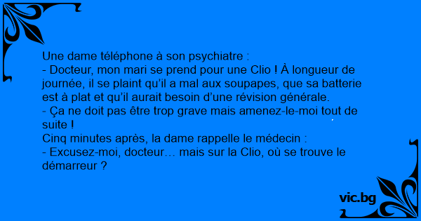 - Docteur, mon mari se prend pour une Clio ! À longueur de journée, il se plaint qu’il a mal aux soupapes, que sa batterie est à plat et qu’il aurait besoin d’une révision générale.